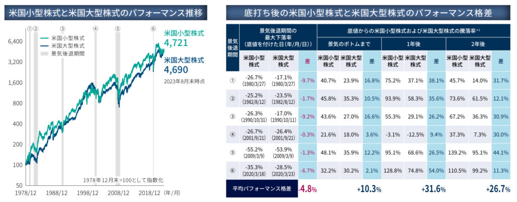 米国大型株と小型株を比べてみると、同じような動きをしてはいますが、やはり小型株の方が上下のブレが大きく(リスクが大きい)、力強い米国市場においては、これまでリターンの上振れが大きかったようです。