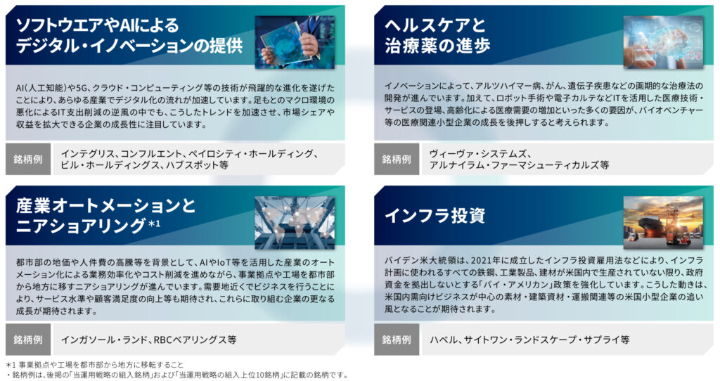 これが今度キーとなるテーマです。そしてこちらがそれぞれテーマごとの投資先。
