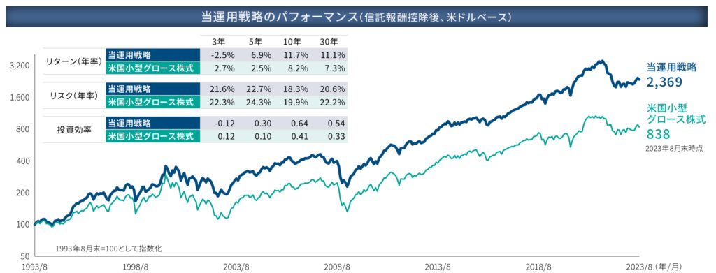 1993年の設定来、順調に上がっています。米国小型グロース株の平均が838%なのに対し、同ファンドは2369%。大幅に上回っていますね。