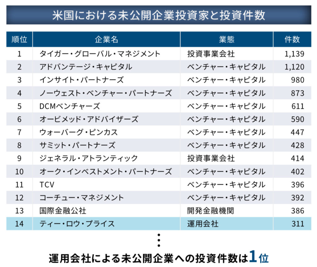 非上場株へ投資をするのは通常、投資会社、VC(ベンチャーキャピタル)、公的機関なのですが、ティー・ロウ・プライスはファンドとしては一番件数を投資しているようです(14位)。