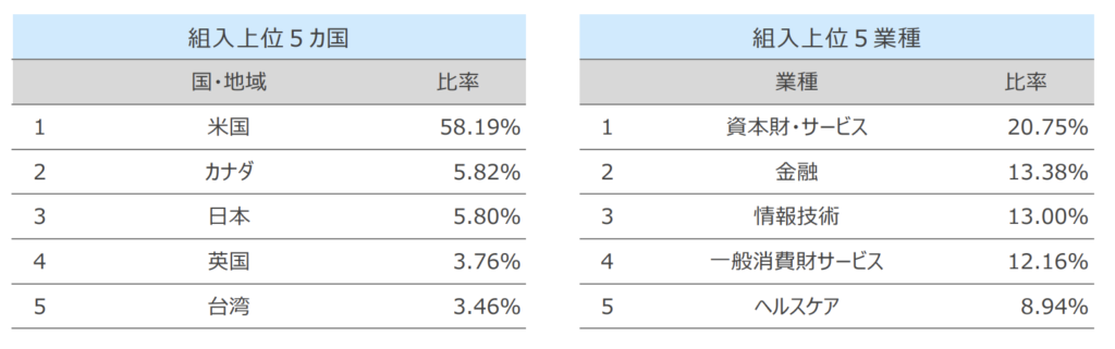 2つのETFそれぞれの「比率」は最新の月次レポート↑の通りですが、組入上位5カ国と組入上位5業種は以下のとおりです。