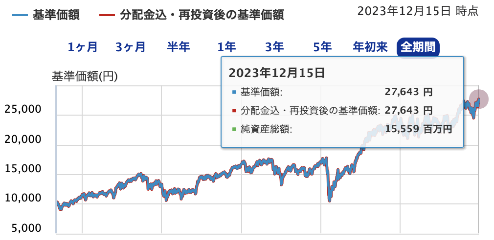 また、SBI証券のサイトで確認した「基準価額」の推移(2023年12月15日時点)は以下のとおりです。