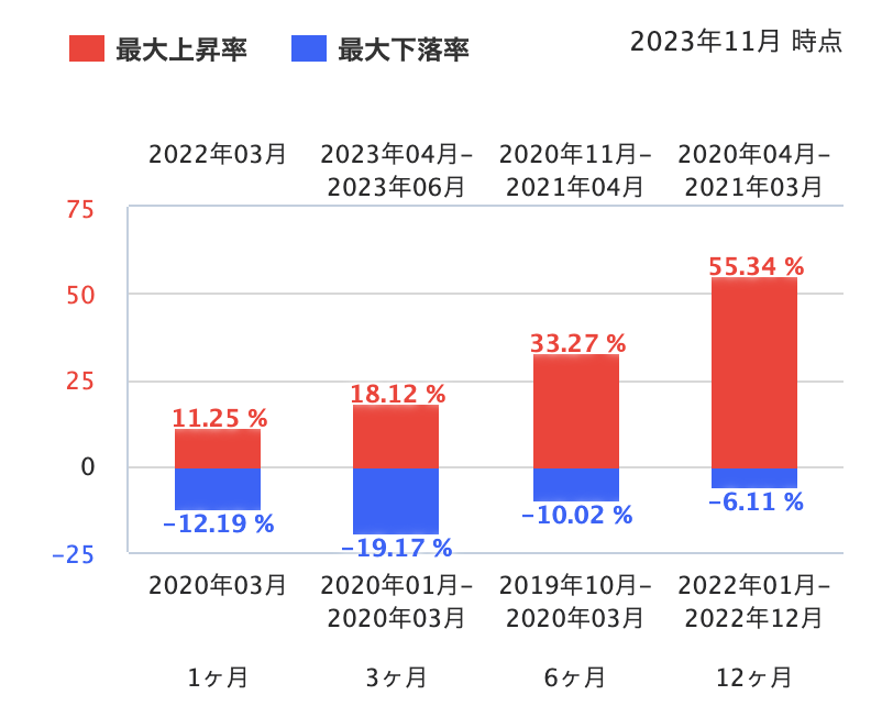 「EXE-i グローバル中小型株式ファンド(上)」の方が、「最大上昇率」と「最大下落率」ともに大きいのが見て取れるかと思います。