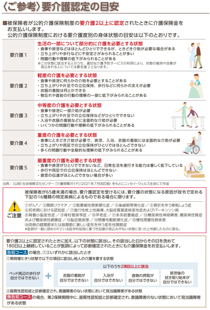 ・被保険者が公的介護保険制度による要介護認定を受け、要介護2以上に認定されたとき。