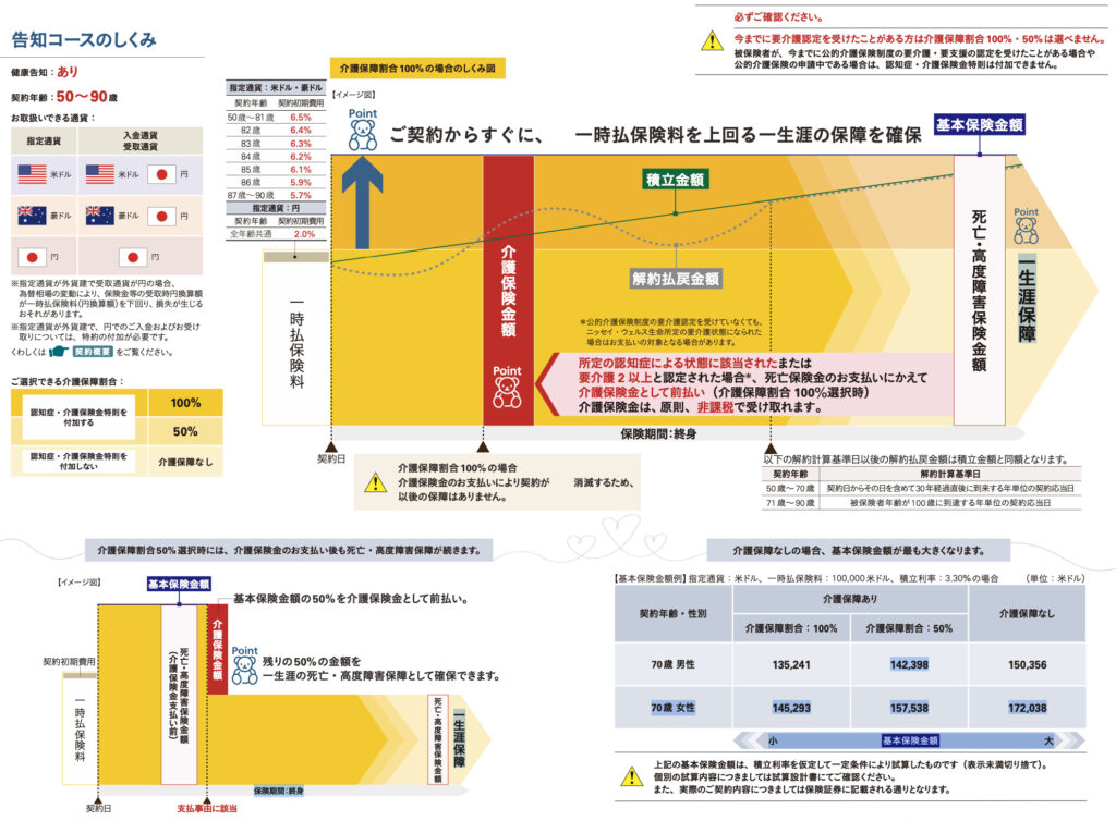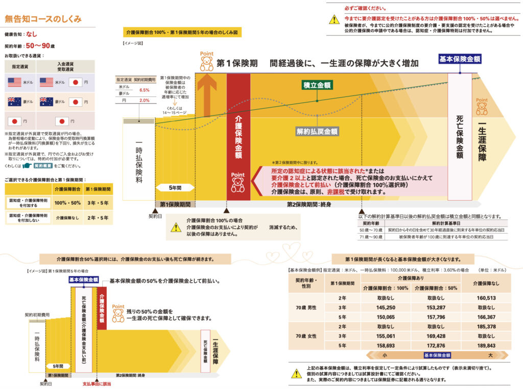 通貨指定型一時払終身保険で無告知で90歳まで加入できます。ただし、内容を決めるための選択肢がかなり多いです。まずは運用通貨を3つの通貨(米ドル、豪ドル、日本円)から選択します。次に告知コースか無告知コースを選択します。無告知コースの場合は、第1保険期間(2年、3年、5年)も選択します。そして介護保障をつけるかどうかの選択をします。介護保障をつける場合は、介護保障割合(50%、100%)も選択します。つまり、、、