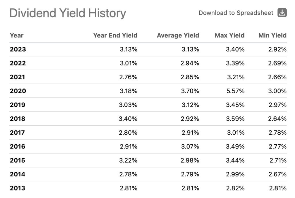 「VYM」の商品ページを見ると、過去30日間のファンド保有の予想配当利回りは3.25%ですが、期末配当利回り(Year End Yield)は3%程度が継続して支払われております。