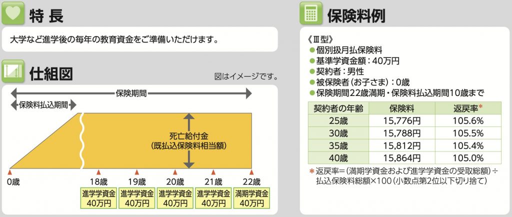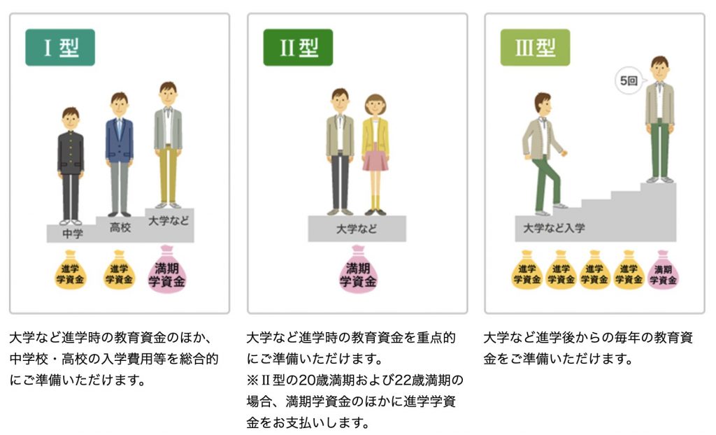 進学学資金や満期学資金を受け取るタイミングに応じて3つの型があります。