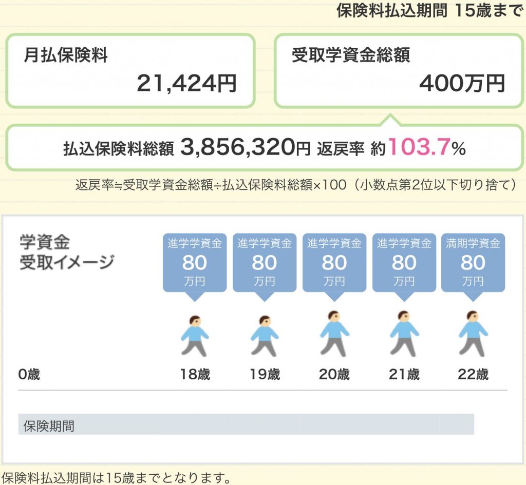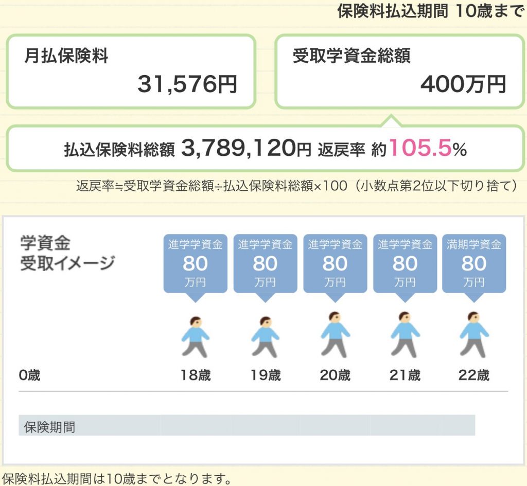 日本国内の学資保険では1番良いと思います。しかし、日本の保険商品の利回りは低くくインフレ負けするので注意が必要です。
