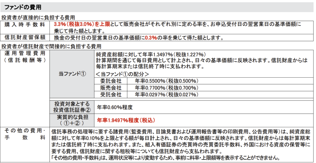 手数料は購入時3.3%、毎年の管理費用は年1.9497%、換金時にも0.3%程度かかります。