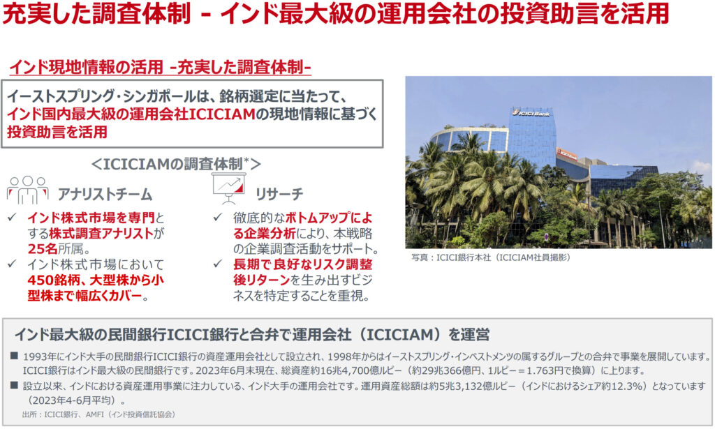 イーストスプリングとインド大手ICICI銀行の合弁会社である、ICICIAMの投資助言を活用していくようです。