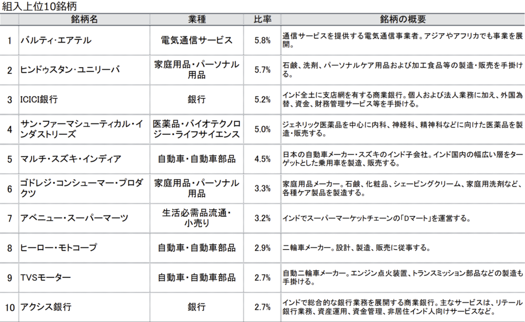 自動車関連が20%弱と業種としては一番多く、銀行、家庭用品、医薬品と続きます。先ほどの投資助言会社の親会社、ICICI銀行も組み入れ銘柄に入っていますね。