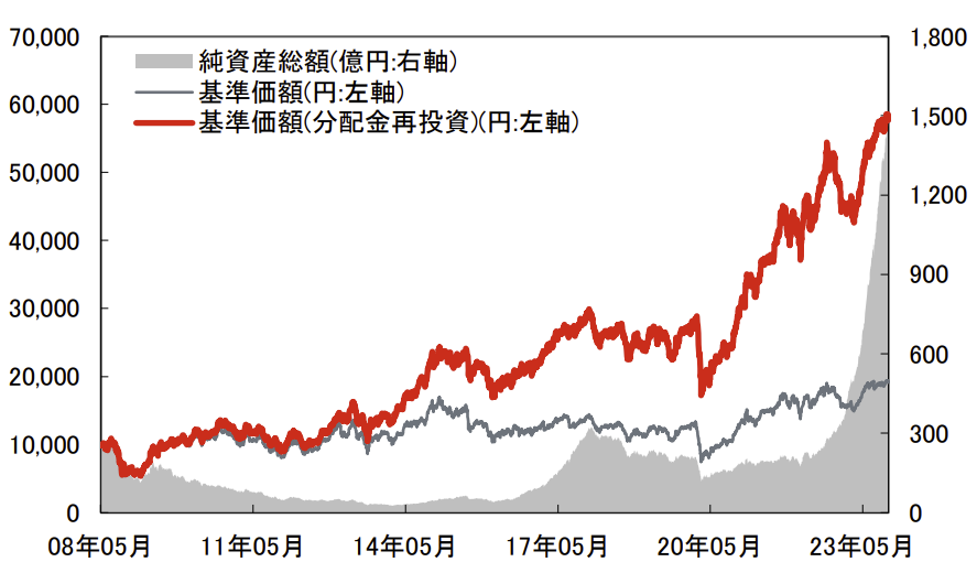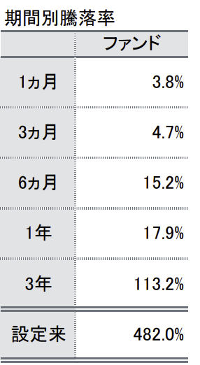 直近1年で+17.9%、3年で+113.2%の騰落率になります。またこちらのファンドは分配金が出る場合もあり直近0円-1000円の間で推移しています。
