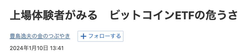 ビットコイン現物ETFの承認により大きなお金が流れ込んでビットコイン価格が上昇する可能性はありますが、ビットコインへ投資するならば、豊島逸夫氏の意見も参考にしてください。