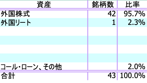 最新(2023年12月29日時点)の月次リポートにおける資産別構成は以下となっておりますが、