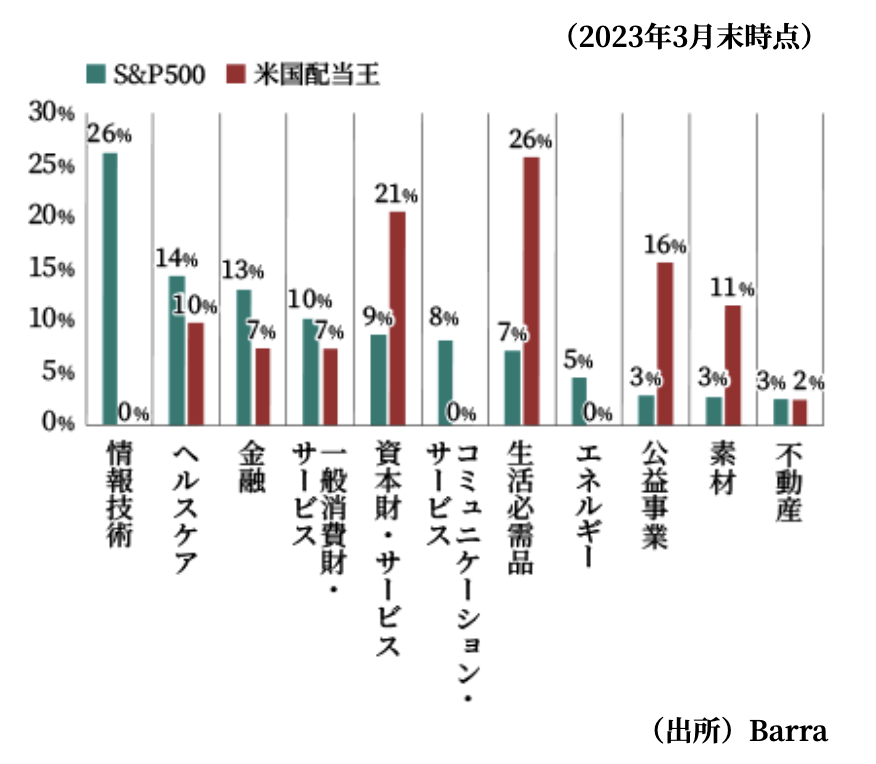 米国配当王のポートフォリオは生活必需品や資本財・サービスなどのセクター比率が高いのですが、一方で、情報技術セクターの比率は0%となっております。