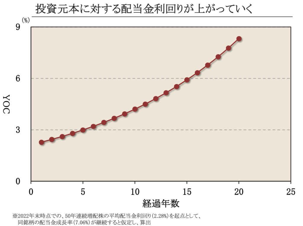 連続増配銘柄は1株あたりの配当金額が増え続けている銘柄ですから、投資元本に対する利回りが毎年増加していきます。
