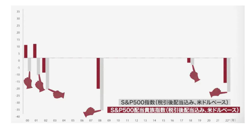 同じタイミングにおける連続増配銘柄「S&P500配当貴族指数」のパフォーマンスを見ていただくと、S&P500指数よりも下落幅が小さい、むしろプラスリターンになっているのが確認できるかと思います。