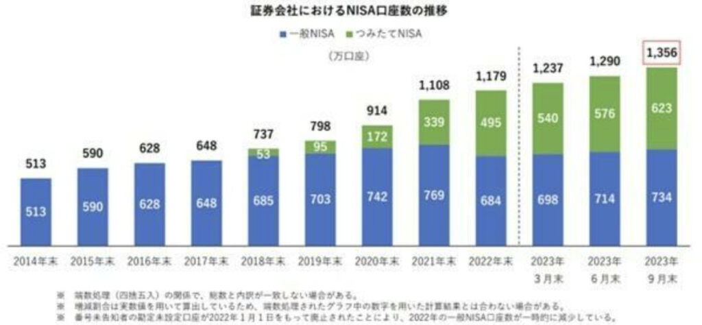 金融庁の「NISA口座の利用状況調査」を確認してみると、2023年9月末時点が最新のデータとなっており、NISA(一般・つみたて)口座数の合計は2,034万7312口座となっておりました。