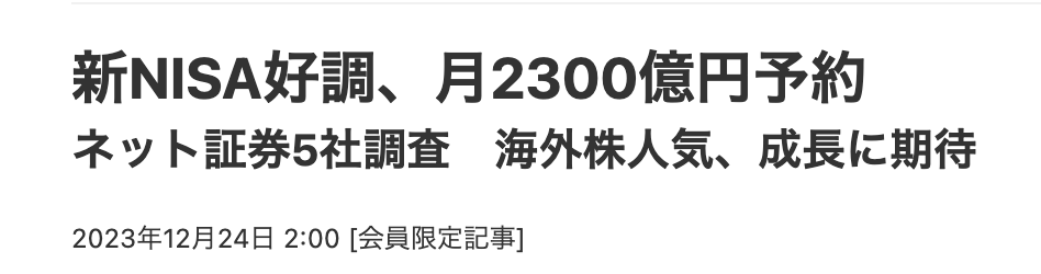 ネット証券大手5社(SBI証券、楽天証券、マネックス証券、松井証券、auカブコム証券)の調査によると、2023年12月24日時点における(毎月定額で投資信託を購入する)事前予約額が月2,300億円あったとのことです。