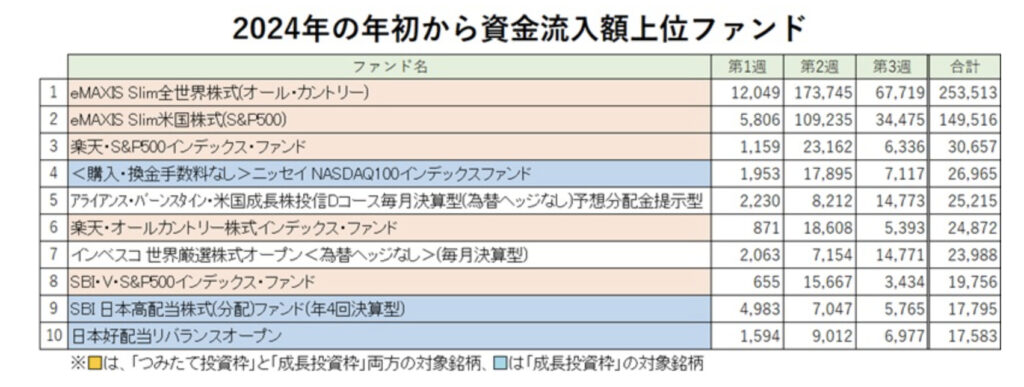 ウエルスアドバイザーが調べた2024年1月4日から1月19日までの投資信託の資金流出入のランキングを見ると、TOP10のファンドは以下の通りです。