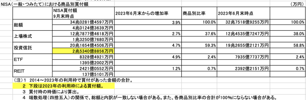金融庁の「NISA口座の利用状況調査」からNISA(一般・つみたて)における商品別買付額を見てみると、2023年9月末時点における投資信託の金額は2兆5340億8,856万円ですから、こちらも年間で考えると約3兆3,798億円。