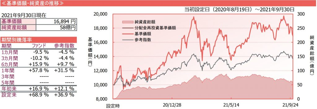 2020年8月19日設定でまだ新しいファンドですが、ですが1年と2カ月で68.9%のプラスになっています。この1年でも57.8%のプラスになっています。 コロナ後のNASDAQ上昇の恩恵を受け、かなり上昇していました。