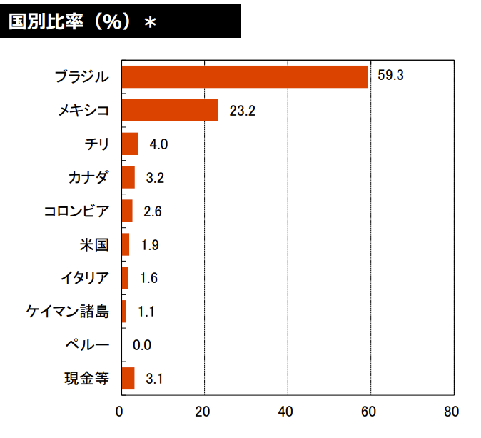 手数料は高いですが、直近騰落率はいいですね。ただ投資先の国別比率が引っかかります。この比率ならブラジルのみに投資するファンドの方が騰落率が良いような気がします。
