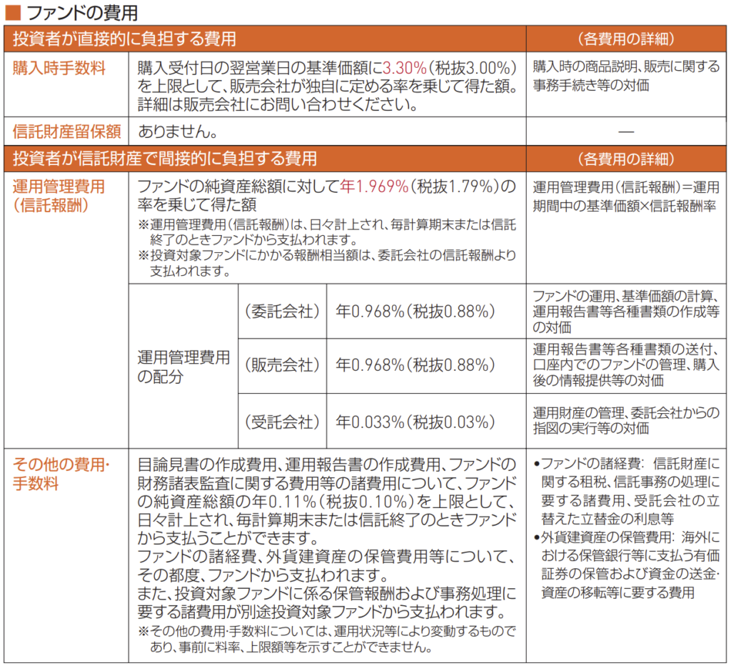 購入時手数料は3.3%、毎年の管理費用は年1.969%、その他手数料が0.11%程度かかります。