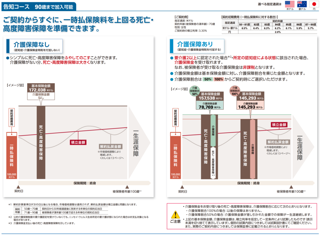 通貨指定型の一時払終身保険で無告知で90歳まで加入できます。ただし、内容を決めるための選択肢がかなり多いです。まずは運用通貨を3つの通貨(米ドル、豪ドル、日本円)から選択します。次に告知コースか無告知コースを選択します。無告知コースの場合は、第1保険期間(2年、3年、5年)も選択します。そして介護保障をつけるかどうかの選択をします。介護保障をつける場合は、介護保障割合(50%、100%)も選択します。つまり、、、