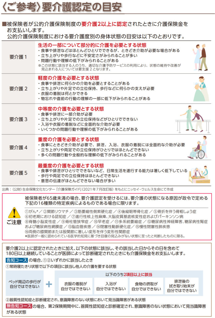 ・被保険者が公的介護保険制度による要介護認定を受け、要介護2以上に認定されたとき。