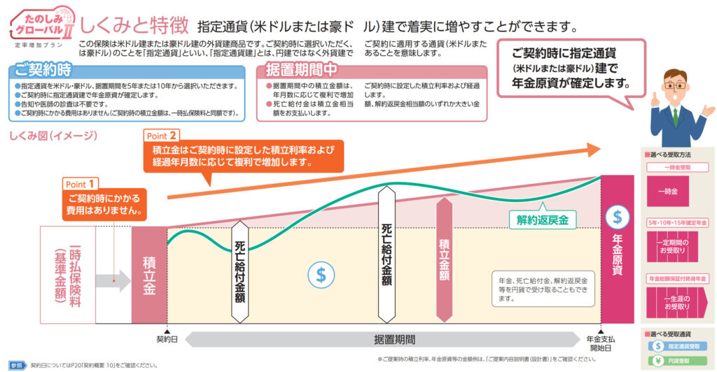 一時払の個人年金保険です。通貨は2種類(米ドル/豪ドル)から選択でき、契約時の積立利率で運用されます。積立利率は1日と16日に更新され、据置期間(5年/10年)と通貨によって変わります。据置期間で増やした年金原資は一括受取、確定年金、終身年金から選択できます。