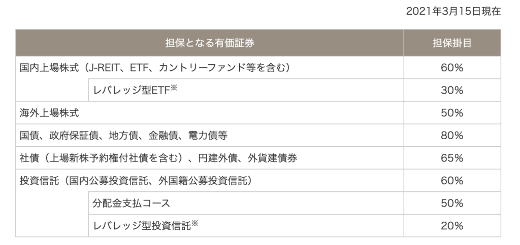 なお、参考までに、以下は大和証券の有価証券ごとの担保掛目となります。