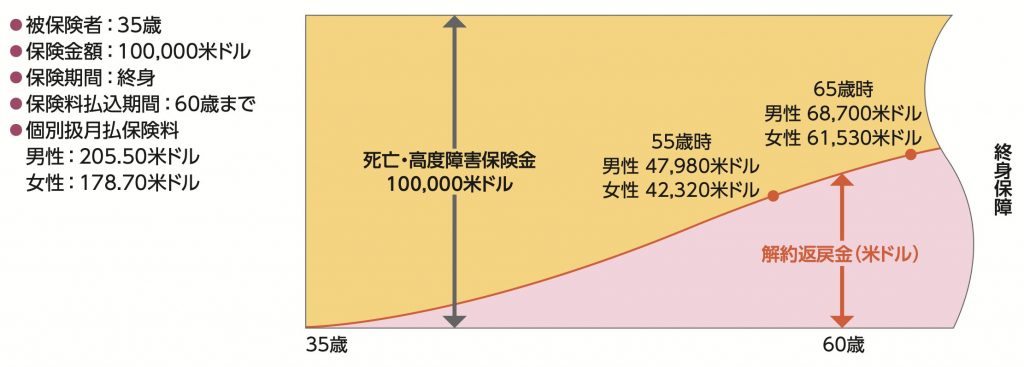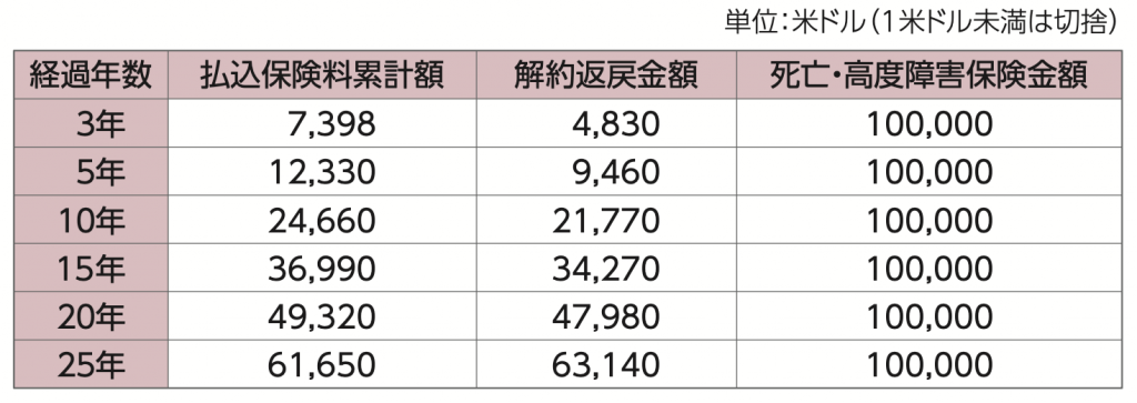 予定利率は2.5%と国内トップクラスですが、普通の米ドル建終身保険です。終身保険なので一生涯の死亡保障と貯蓄機能がありますが貯蓄性はとても低いので、貯蓄を目的で契約する必要はありません。また貯蓄機能があることで、死亡保障額に対する保険料が高いことがデメリットです。