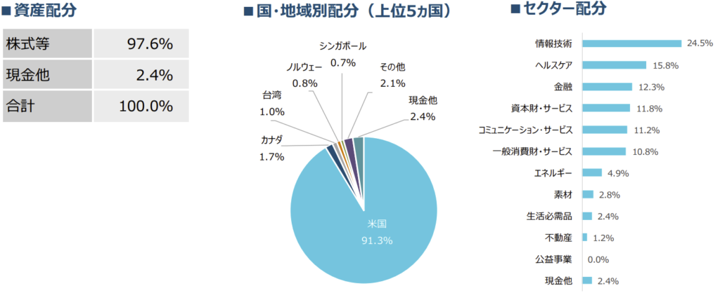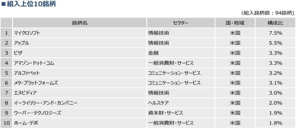 ほぼ米国株ですが、一部米国以外の銘柄も入っているようです。また投資先はIT企業が多いですが、いわゆるGAFAM銘柄が上位で投資方針同様、あまり特色はないように見えますね。