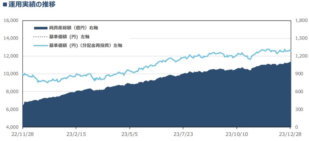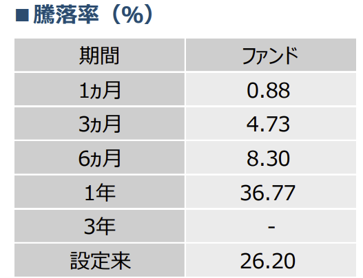 直近1年で+36.77%、設定来で+26.20%の騰落率になります。ファンド設定が22年11月なので1年と3か月の実績になります。