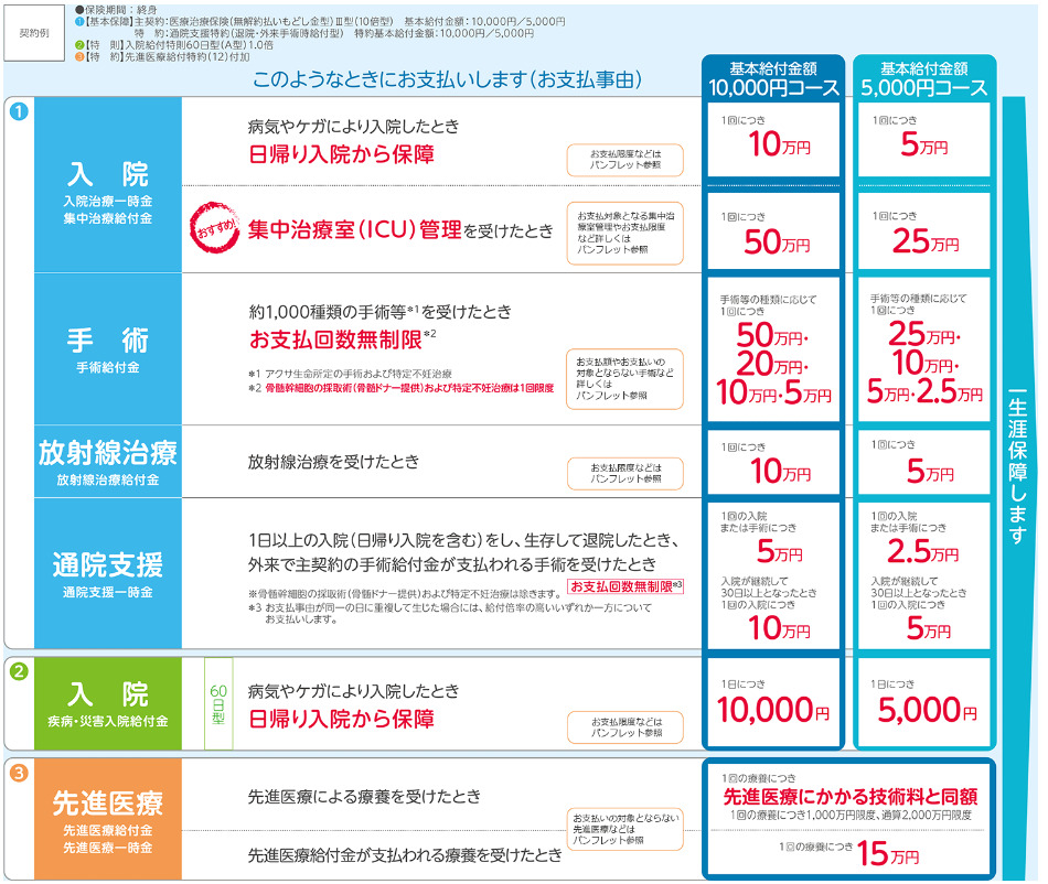 アクサ生命の「一生保障」の医療保険スマート・ケア の基本保障は、次の通りです。