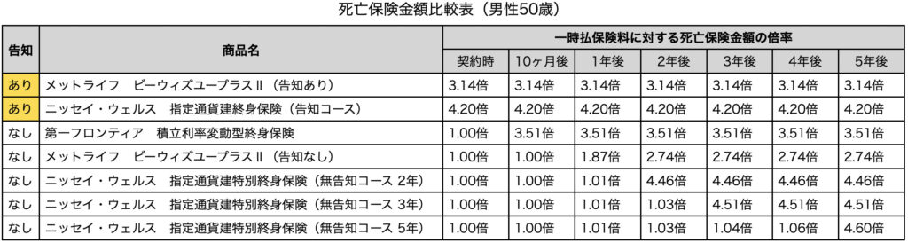 これらの商品で告知の有無と色々なタイプ別に死亡保障倍率を比較します。