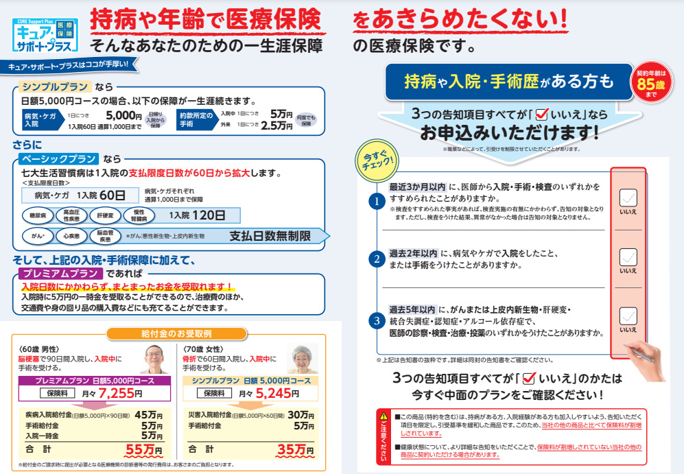 最近、テレビCMで保険会社各社が医療保険をPRし、資料請求の問い合わせを促しています。近年はご高齢の方やご持病をお持ちの方でも加入できる商品も増えています。「オリックス生命 医療保険 CURE Support Plus[キュア・サポート・プラス]」が紹介されているCMを見たことのある方は多いのではないでしょうか。