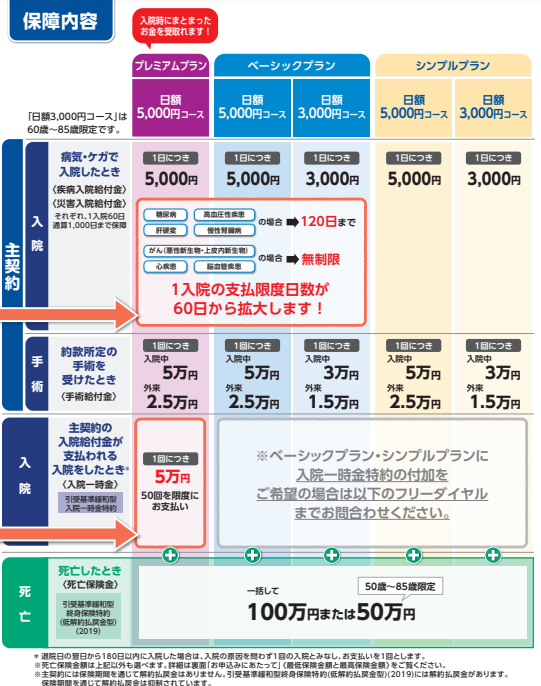 病気・ケガによる入院給付金が支払われる入院後に生存して退院したときに一時金を受け取れます。通算50回まで受け取れ、設定金額は最大10万円です。