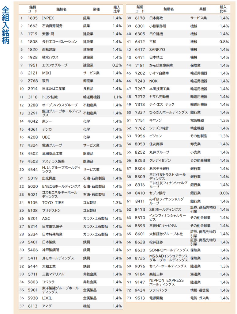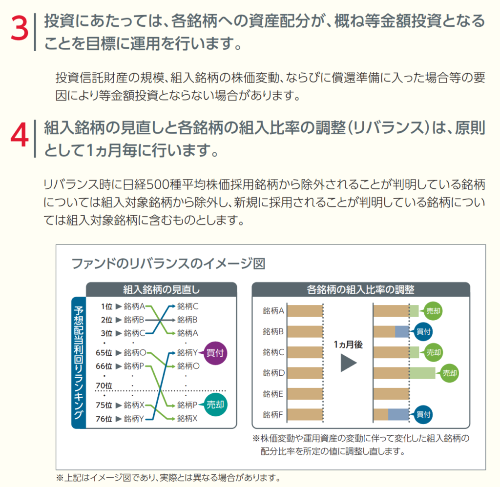 日経500種平均株価採用銘柄の中から予想配当利回りが高い順に上位70銘柄程度を投資対象とし、毎月リバランスするようです。