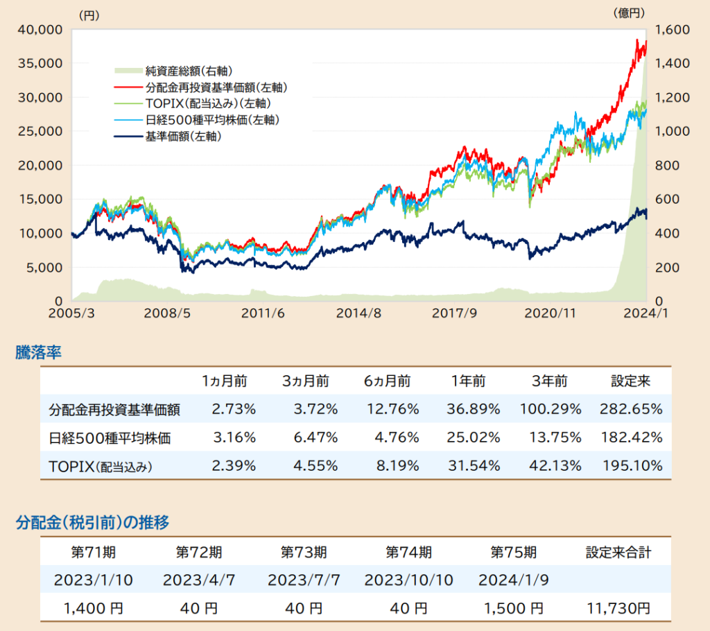 直近1年で+36.89%、3年で+100.29%の騰落率になります。またこちらのファンドは年4回分配金があり、直近の分配金実績は40円~1500円程度です。