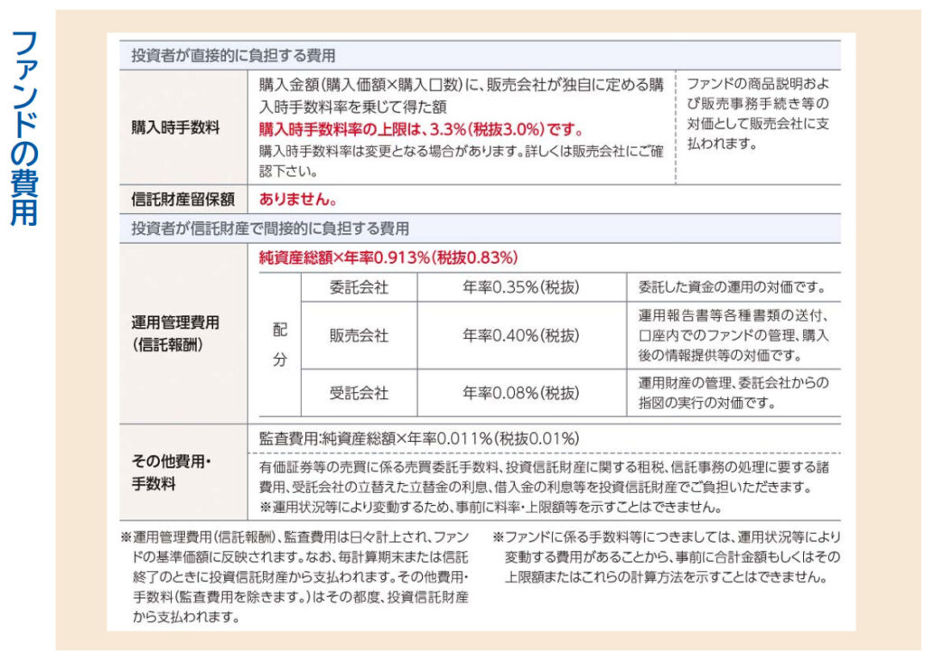 購入時手数料は3.3%、毎年の管理費用は年率0.913%程度、その他手数料もかかります。
