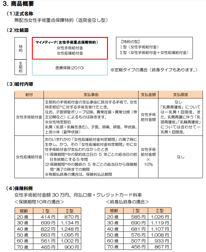 - 無配当女性手術重点保障特約(商品名:マイメディーナ)
