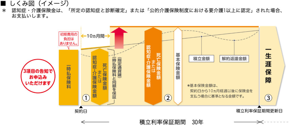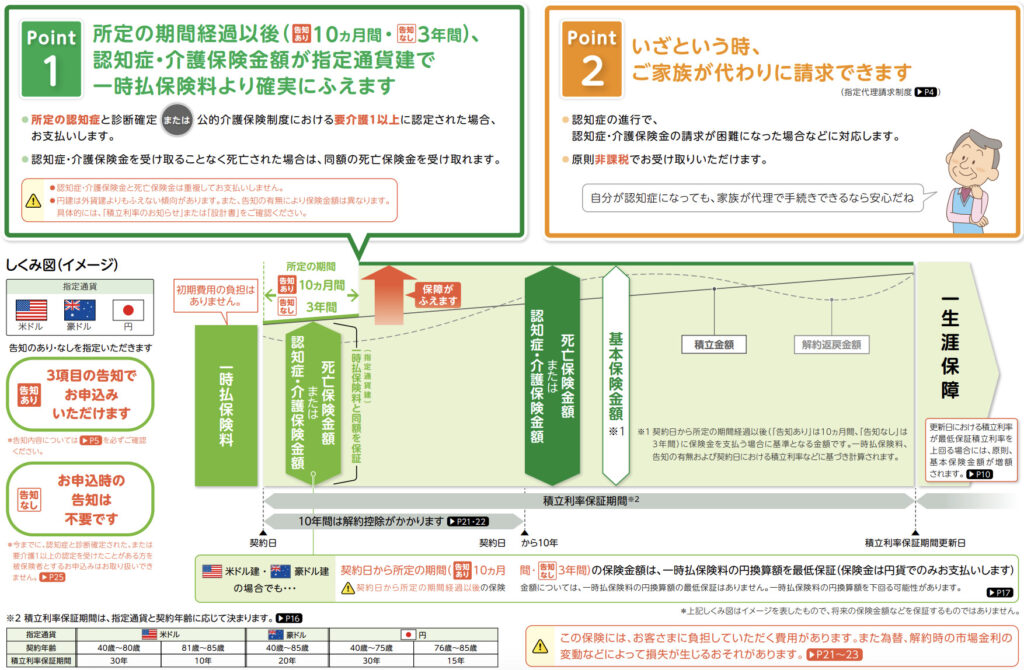 通貨指定型の一時払終身保険で無告知で85歳まで加入できます。死亡だけではなく、所定の認知症や介護になったときにも保険金が受け取れます。告知の有無によって保険金が増えるタイミングが変わります。告知をすると契約から10ヶ月後に保険金額が増えます。告知なしの場合は保険金額が増えるのが3年後になります。あとは契約した時の積立利率に応じて解約返戻金が増えていきます。10ヶ月後や3年後に増える保険金額も積立利率に起因します。