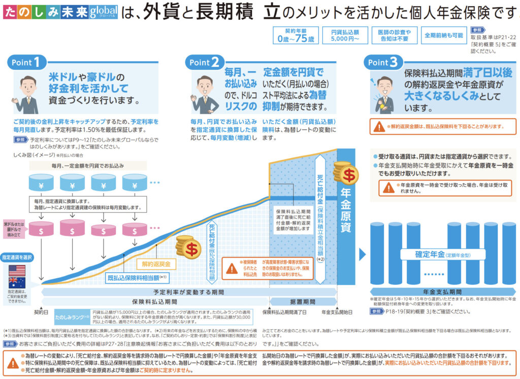 今回は住友生命の個人年金保険「たのしみ未来グローバル」を解説します。こちらは住友生命の商品ですが、証券会社、地方銀行、信用金庫、保険代理店で販売されている商品になります。