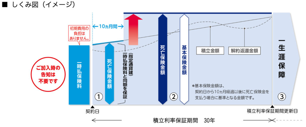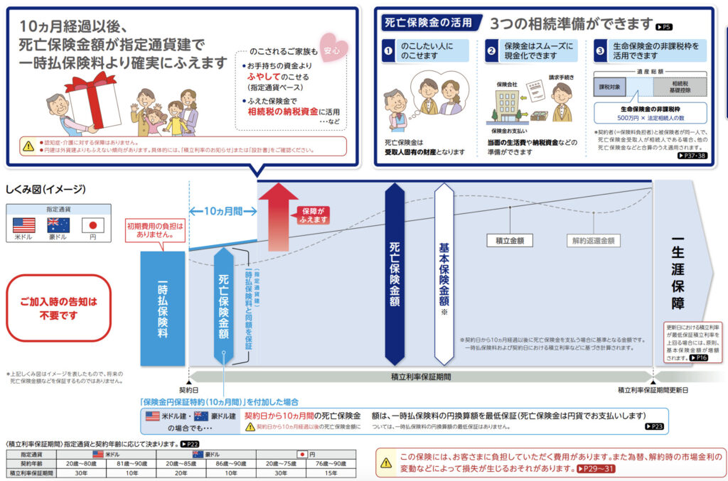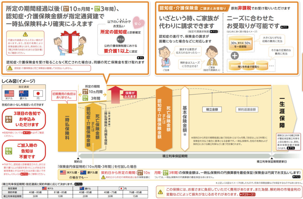 通貨指定型の一時払終身保険で無告知で90歳まで加入できます。プランは2種類で死亡保障プランと認知症・介護プランがあります。死亡保障プランは契約から10ヶ月後に保険金額が増えます。認知症・介護プランには告知タイプもあり、告知をすると契約から10ヶ月後に保険金額が増えます。告知なしの場合は保険金額が増えるのが3年後になります。あとは契約した時の積立利率に応じて解約返戻金が増えていきます。10ヶ月後や3年後に増える金額も積立利率に起因します。