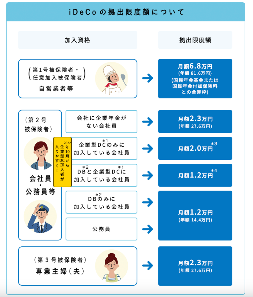 基本的に20歳以上65歳未満の方であれば誰でも利用できますが、ご自身がどの区分に属しているかによって、拠出できる掛金の上限は異なります。