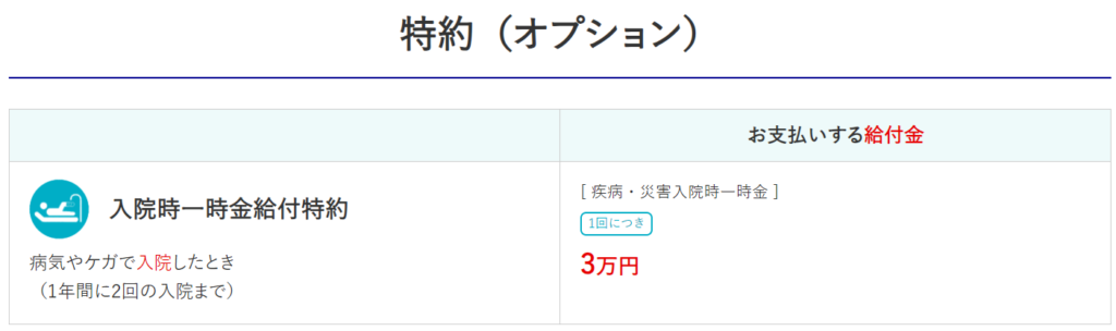 病気やケガで入院したとき1年間に2回の入院まで疾病・災害入院時一時金として1回につき3万円受け取れる特約です。