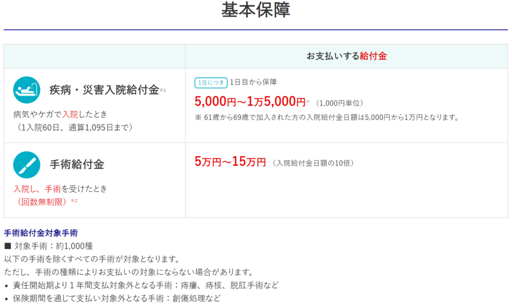 疾病・災害入院給付金(入院給付日額)は入院1日目から保障があり、5,000円~15,000円の間かつ1,000円単位での設定が可能です。基本的に、入院給付日額の金額設定が手術給付金の保障額に関わります。