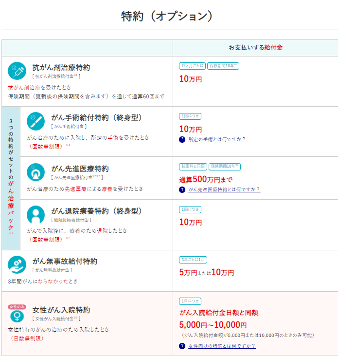抗がん剤治療特約ならびにがん先進医療特約は10年に1度更新が必要です。したがって、終身型ではありますが、10年に1度保険料が高くなります。
